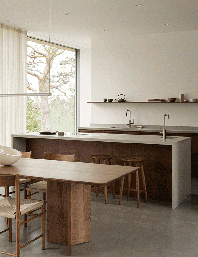Japandi beholder sin sterke posisjon i kjøkkentrendene i 2026. Her smelter tre, stein og jordfarger sammen i en harmonisk helhet som hyller håndverk, enkelhet og naturens skjønnhet.