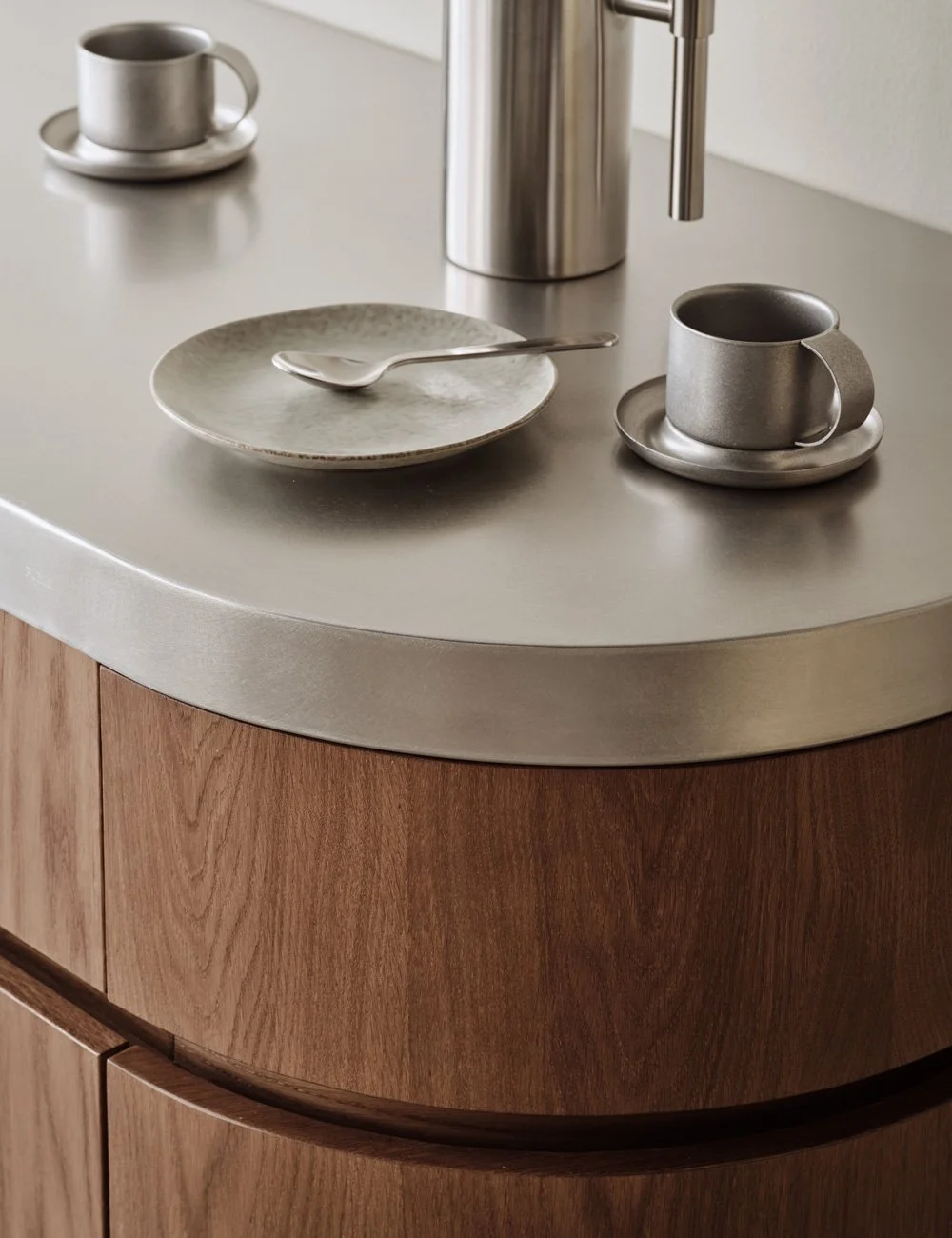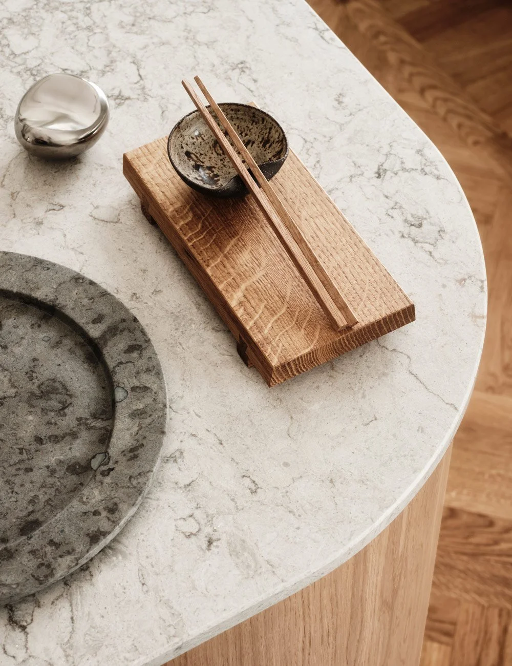 Kjøkkenøy i klarlakkert eik og en lys, matt benkeplate – subtile kontraster mellom varmt og kaldt, matt og blankt. De organiske formene myker opp helhetsinntrykket og skaper en følelse av ro og eleganse – en tolkning av myk minimalisme der kontraster finnes, men aldri blir harde.