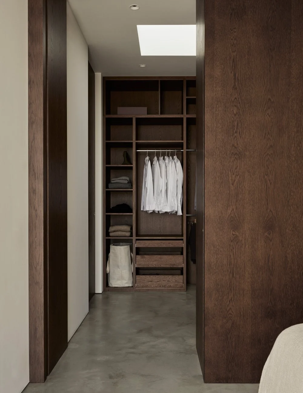 Selv oppbevaringsløsninger, som walk-in-closet, knytter seg til kjøkkenet og badet i samme toner og materialer – og skaper en sømløs helhet i hele hjemmet. Se mer fra Pine Edge villa fra Grand Designs.