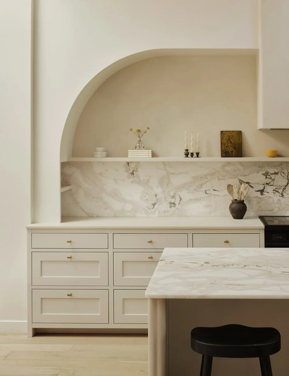 Kremhvite nyanser og naturstein i matchende toner gir kjøkkenet et rolig og tidløst preg.
