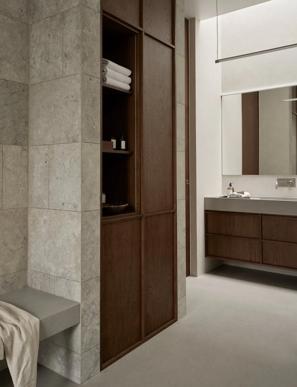 Et enhetlig formspråk og repeterende materialer skaper ro og helhet i hjemmets rom – fra kjøkken til bad og oppbevaring. Her er grå kalkstein, varm eik og lyse vegger de foretrukne materialene.