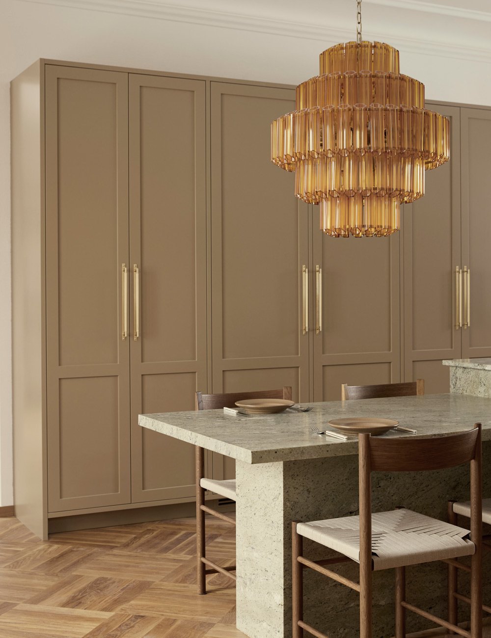 Shakerfrontene i den dempede mørk beige tonen skaper et rolig og harmonisk uttrykk som fremhever kjøkkenets tidløse, klassiske design.