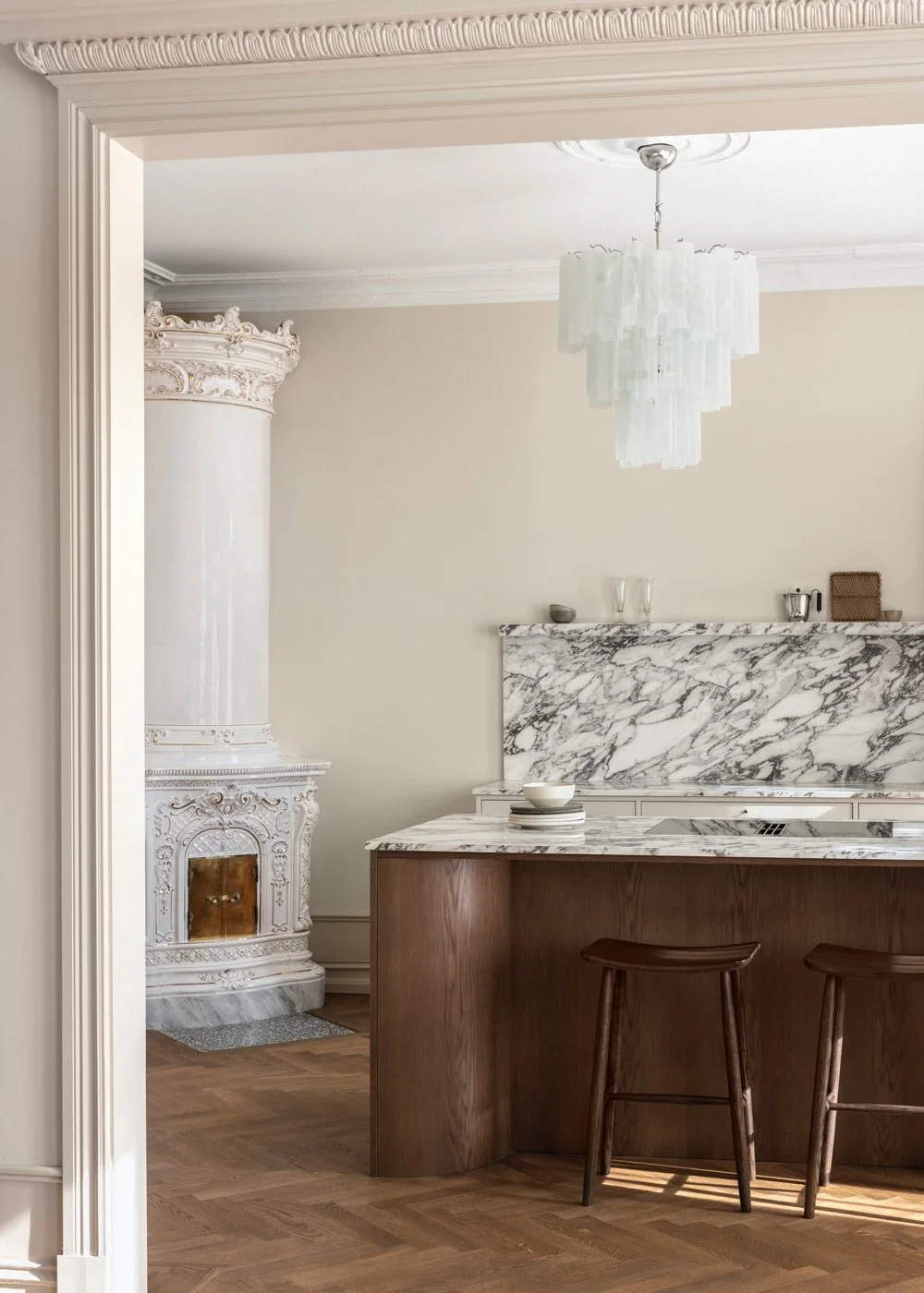For en vakker leilighet fra 1905 i Göteborg har vi skapt et moderne beige shakerkjøkken. Myke toner av beige og hvitt skaper en lys og sofistikert atmosfære, kontrastert av moderne innslag som en livlig benkeplate og en kjøkkenøy i mørk eik med avrundede former.