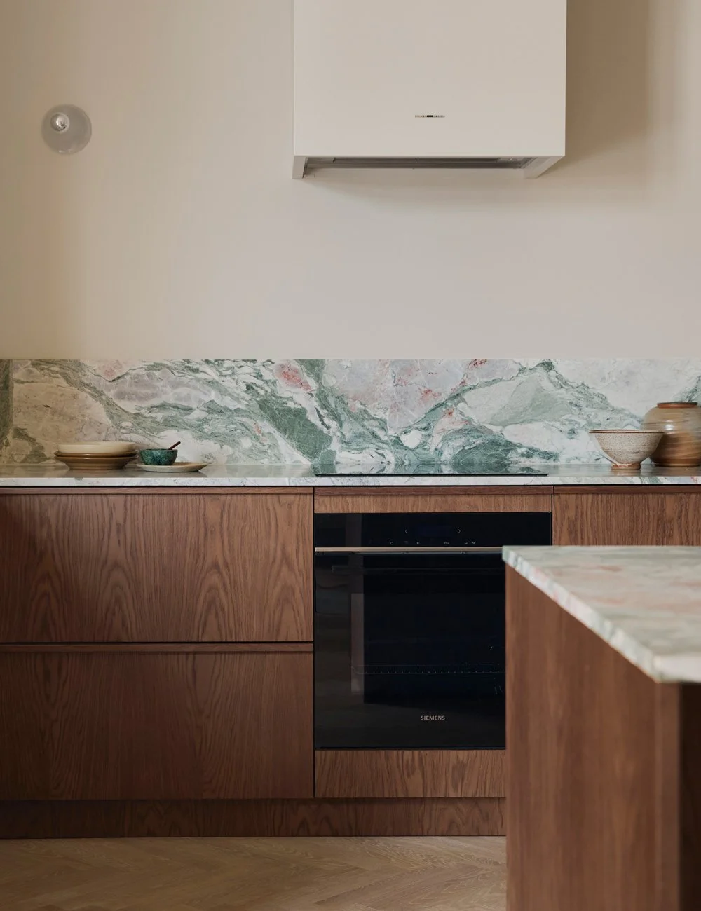 For å smelte sømløst inn ble ventilatorhetten fra Fjäråskupan malt i samme beige farge som veggen og høyskapene, noe som lar naturmaterialene stå i fokus. Ovn fra Siemens.