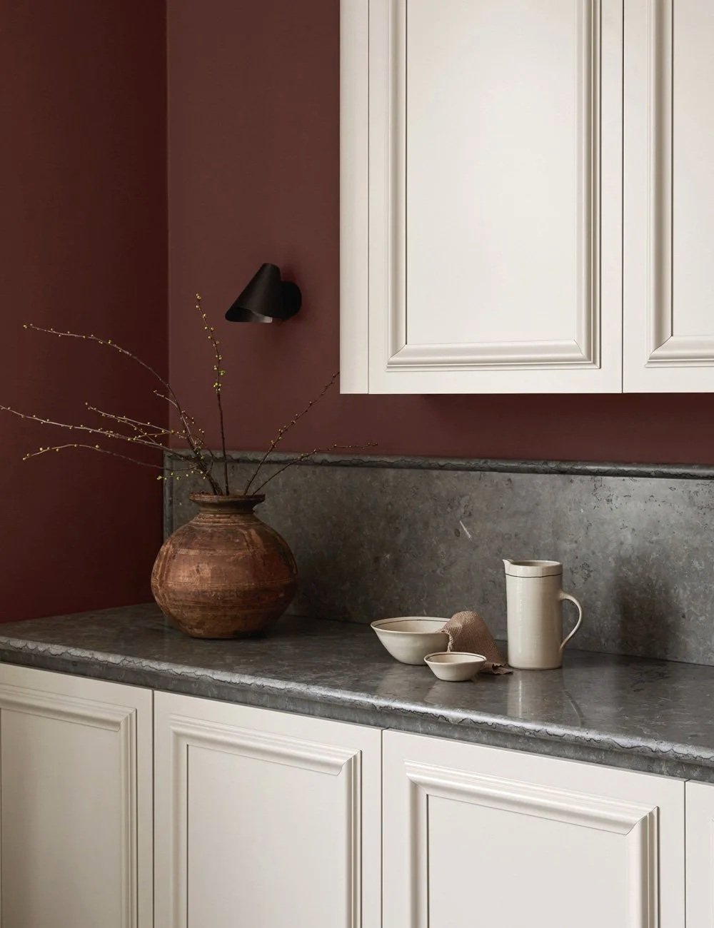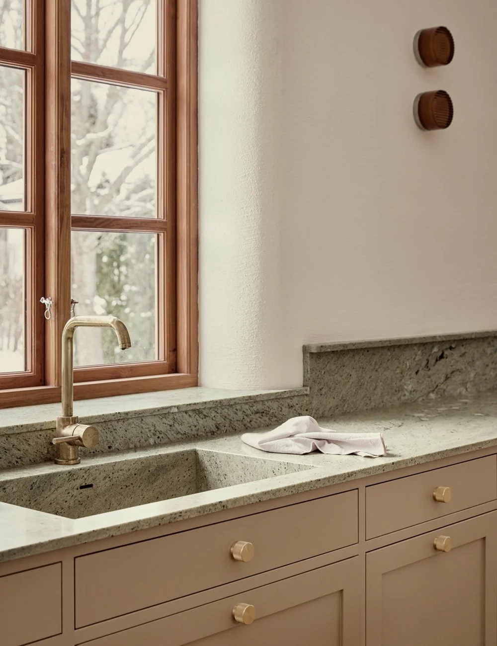 Et klassisk kjøkken i mørk beige, som forener ekte håndverk, rustikke naturmaterialer og tidløst nordisk design.