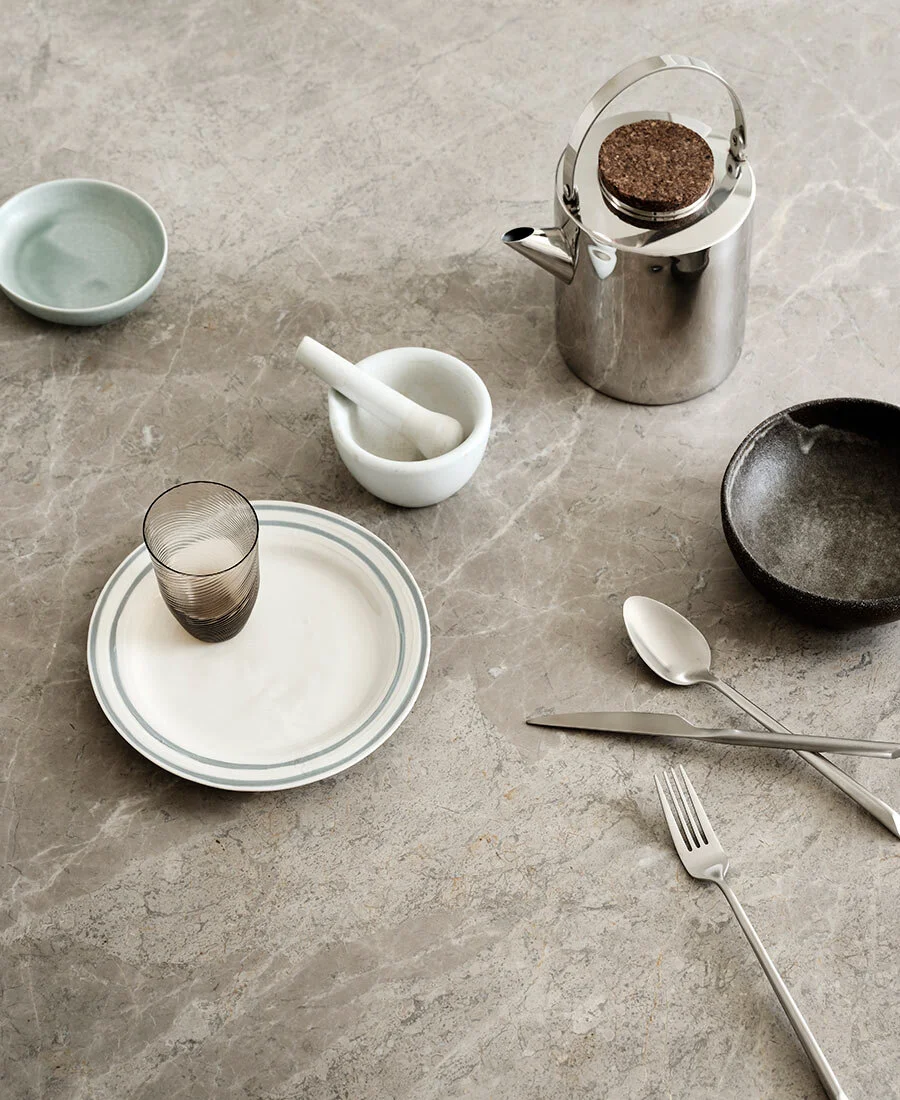 Den vakre benkeplaten er av Emperador Grey-marmor, en spesielt lun variant av marmor som likevel har et tidløst og luksuriøst uttrykk. Shakerstilen assosieres med kvalitet, enkelhet, symmetri og naturmaterialer. Se guiden vår til den perfekte benkeplaten.